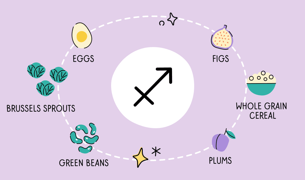 Eggs provide some solid protein, and whole-grain cereals add carbs and fiber to keep Saggitarians fueled and ready to explore. Figs and plums offer potent antioxidants, calcium, and potassium to support the immune system. At the same time, highly nutritious brussels sprouts contain potent antioxidants that help prevent cell damage and protect against oxidative stress.9Hoelzl, C., Glatt, H., Meinl, W., Sontag, G., Haidinger, G., Kundi, M., Simic, T., Chakraborty, A., Bichler, J., Ferk, F., Angelis, K., Nersesyan, A., & Knasmüller, S. 2008 Consumption of Brussels sprouts protects peripheral human lymphocytes against 2-amino-1-methyl-6-phenylimidazo[4,5-b]pyridine (PhIP) and oxidative DNA-damage: results of a controlled human intervention trial. Molecular Nutrition & Food Research DOI:10.1002/mnfr.200700406
