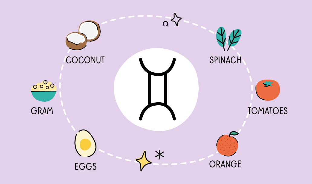 Add protein-rich eggs and grams to fuel your body as well as oranges and tomatoes for a satisfying dose of potassium and Vitamin C. Last but not least, coconuts are a healthy source of fat to add to your Gemini food list!